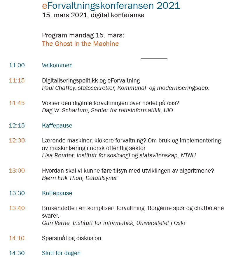Blant innlederne finner vi blant andre statssekretær Paul Chaffey (KMD), Lisa Reutter (NTNU), Guri Verne (UiO), Dag W. Schartum (UiO) og Bjørn Erik Thon (Datatilsynet).