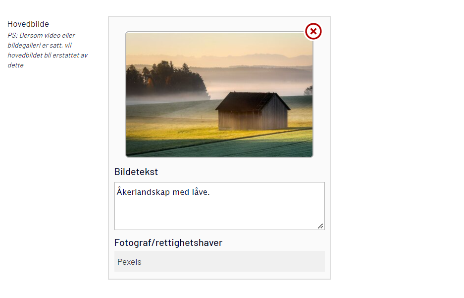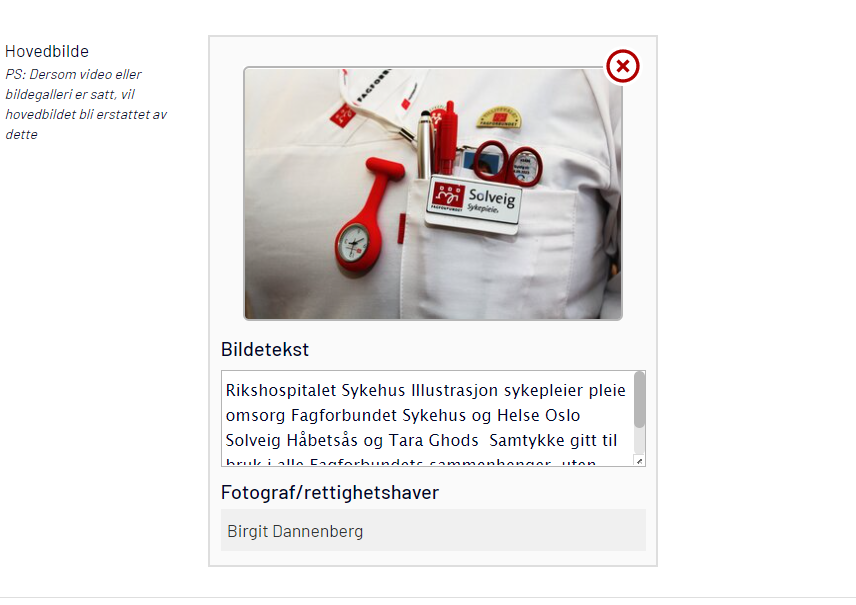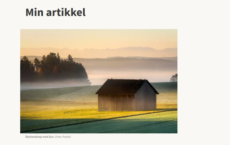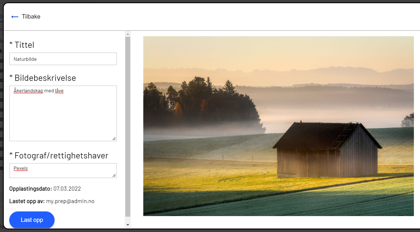 Legg inn tittel, bildebeskrivelse og fotograf/rettighetshaver. Trykk Last opp. Vær oppmerksom på at bildebeskrivelsen også blir bildetekst i artikkelen.