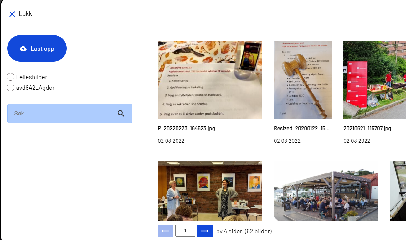 Nå kommer du inn i bildevelgeren. Hvis du er webansvarlig vil du få opp fellesbilder og bilder som hører til din forening.
