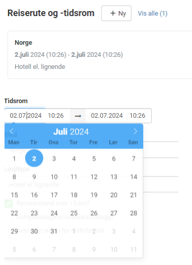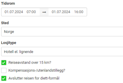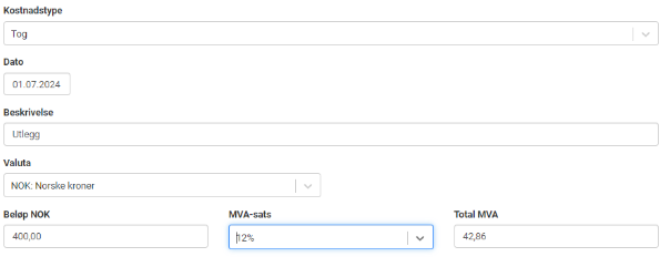 Velg riktig kostnadstype i nedtrekksmenyen, eks. Tog, velg riktig dato og legg inn beløp NOK: