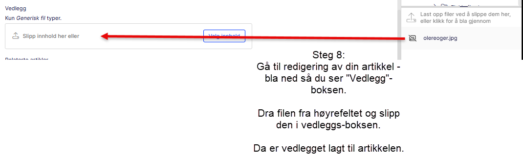 Gå deretter til redigering av din artikkel, og bla ned til "Vedlegg"-boksen i artikkelen (under hovedtekstfeltet). Da kan du dra filen din fra høyre mappe og slippe den i vedleggsboksen for å legge filen som vedlegg på artikkelen.