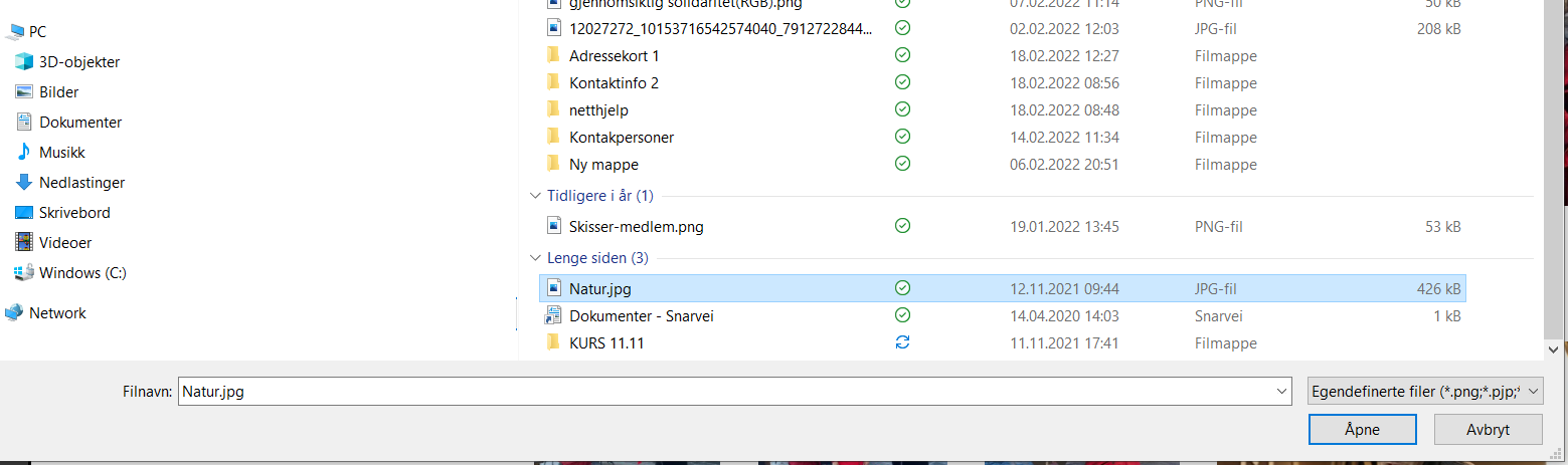 Nå navigerer du deg fram til "mappen din" for å velge filen/vedlegget. Du kan også bruke søkefeltet øverst som vist under.