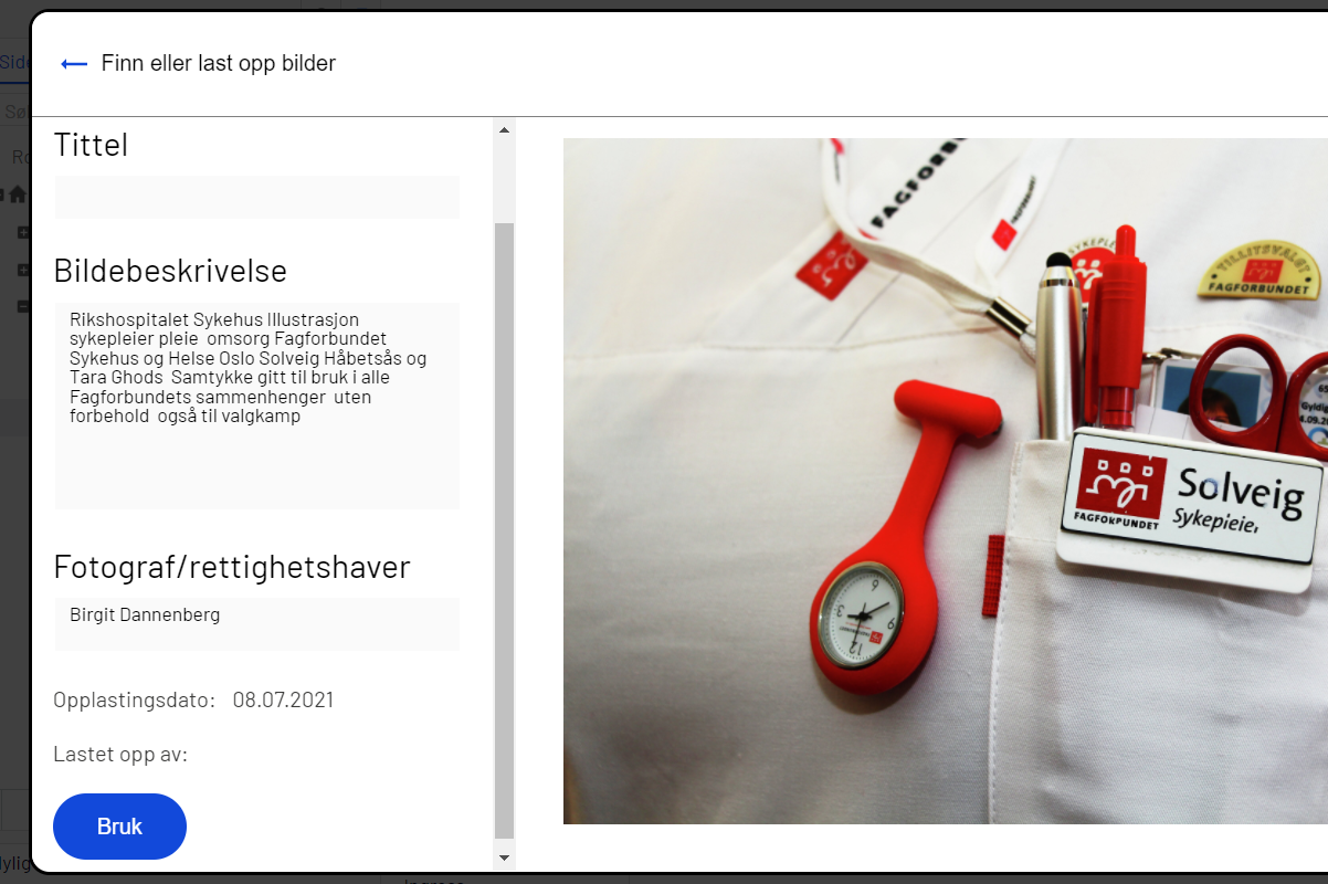 Legg inn tittel, bildebeskrivelse og fotograf/rettighetshaver. Trykk Last opp. Vær oppmerksom på at bildebeskrivelsen også blir bildetekst i artikkelen.